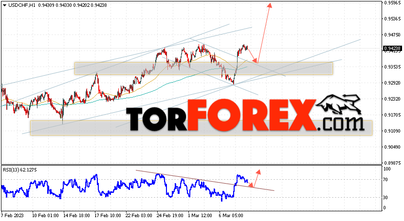 Таким образом, USD/CHF прогноз Доллар Франк на 9 марта 2023 предполагает попытку развития коррекции и теста области поддержки вблизи уровня 0.9365. Далее, продолжение роста валютной пары USD/CHF с целью выше уровня 0.9585. Дополнительным сигналом в пользу подъёма пары Доллар Франк выступит отскок от линии тренда на индикаторе относительной силы. Отменой варианта роста станет падение и пробой области 0.9235. Это укажет на пробой уровня поддержки и продолжение снижения пары с потенциальной целью ниже уровня 0.8975.