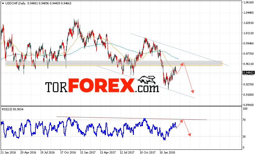 В пользу падения пары Доллар Франк выступит тест линии тренда на индикаторе относительной силы. Отменой варианта снижения USD/CHF станет сильный рост и пробой области 0.9800, что укажет на пробой верхней границы нисходящего канала и продолжение роста пары на Форекс. Подтверждением падения пары выступит пробой области поддержки и закрытие котировок ниже области 0.9350.