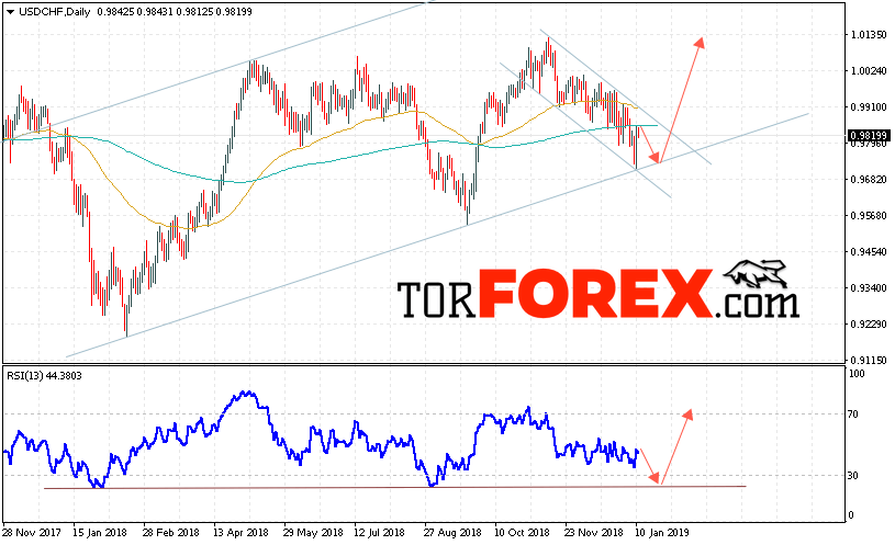 В пользу роста пары Доллар Франк выступит тест линии поддержки на индикаторе относительной силы. Отменой варианта роста USD/CHF станет падение и пробой области 0.9660. Это укажет на пробой нижней границы канала и продолжение падения пары на Форекс. Подтверждением роста пары на текущей торговой неделе 14 — 18 января 2019 выступит пробой верхней границы нисходящего канала и закрытие котировок выше уровня 0.9935.