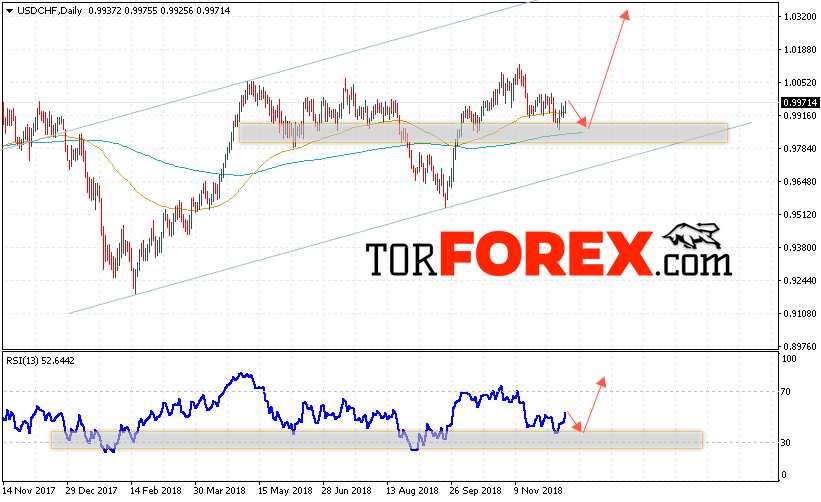 Таким образом, USD/CHF прогноз Форекс на неделю 17 — 21 декабря 2018 предполагает попытку теста уровня поддержки вблизи области 0.9850. Затем продолжение роста USD/CHF в область выше уровня 1.0320. В пользу роста выступит тест линии тренда на индикаторе относительной силы. Отменой варианта роста USD/CHF станет пробой области поддержки и закрытие котировок ниже уровня 0.9720. Это укажет на продолжение падения пары.