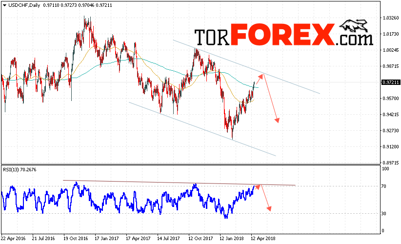 Таким образом, USD/CHF прогноз Форекс на неделю 23 — 27 апреля 2018 предполагает попытку теста уровня сопротивления вблизи области 0.9780 и продолжения падения USD/CHF в область ниже уровня 0.9335, в пользу падения выступит тест линии сопротивления на индикаторе относительной силы, отменой варианта падения USD/CHF станет пробой верхней границы нисходящего канала и закрытие котировок выше 0.9860, что укажет на продолжение роста.