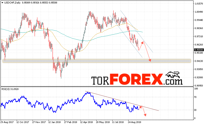В пользу падения пары Доллар Франк выступит тест нисходящей линии тренда на индикаторе относительной силы, а также отскок от верхней границы нисходящего канала. Отменой варианта падения USD/CHF станет сильный рост и пробой области 0.9730, что укажет на пробой верхней границы канала и продолжение роста пары на Форекс. Подтверждением снижения пары на текущей торговой неделе 24 — 28 сентября 2018 выступит пробой области поддержки и закрытие котировок ниже уровня 0.9550.