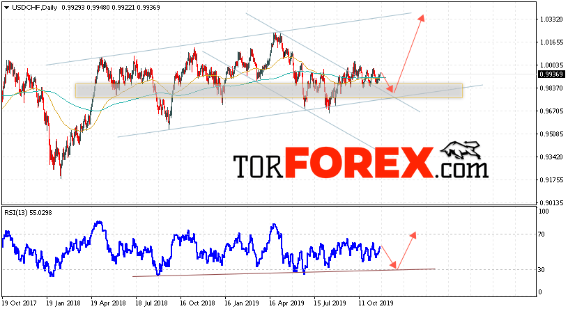 В пользу подъёма валютной пары Доллар Франк выступит тест линии поддержки на индикаторе относительной силы. Вторым сигналом станет отскок от нижней границы восходящего канала. Отменой варианта роста USD/CHF станет падение и пробой области 0.9645. Это укажет на пробой нижней границы канала и продолжение падения пары на Форекс и продолжение падения с целью ниже области 0.9305. Подтверждением роста пары на текущей торговой неделе 25 — 29 ноября 2019 выступит пробой области сопротивления и закрытие котировок выше уровня 1.0055.
