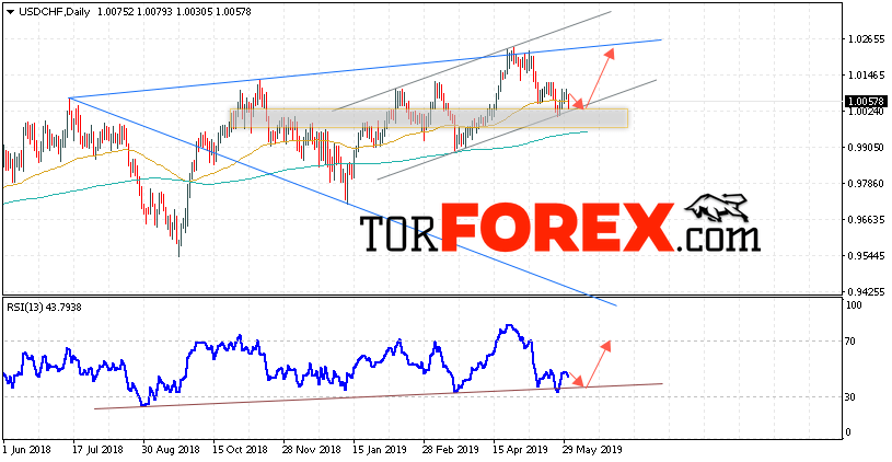 Таким образом, USD/CHF прогноз Форекс на неделю 3 — 7 июня 2019 предполагает попытку теста уровня поддержки вблизи области 1.0025. Затем продолжение роста USD/CHF в область выше уровня 1.0245. В пользу подъёма выступит тест линии тренда на индикаторе относительной силы. Отменой варианта роста USD/CHF станет пробой области поддержки и закрытие котировок ниже уровня 0.9945. Это укажет на продолжение падения пары с потенциальной целью ниже уровня 0.9625.