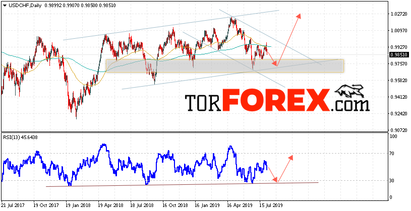 В пользу подъёма валютной пары Доллар Франк выступит тест линии поддержки на индикаторе относительной силы. Вторым сигналом станет отскок от нижней границы восходящей канала. Отменой варианта роста USD/CHF станет падение и пробой области 0.9565. Это укажет на пробой нижней границы канала и продолжение падения пары на Форекс и продолжение падения с целью ниже области 0.9345. Подтверждением роста пары на текущей торговой неделе 5 — 9 августа 2019 выступит пробой области сопротивления и закрытие котировок выше уровня 1.0055, что укажет на выход котировок за пределы нисходящего канала.