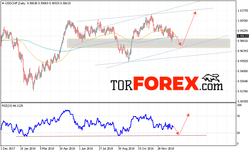 В пользу роста пары Доллар Франк выступит тест линии поддержки на индикаторе относительной силы. Отменой варианта роста USD/CHF станет падение и пробой области 0.9660. Это укажет на пробой нижней границы канала и продолжение падения пары на Форекс. Подтверждением роста пары на текущей торговой неделе 7 — 11 января 2019 выступит пробой области сопротивления и закрытие котировок выше уровня 0.9995.