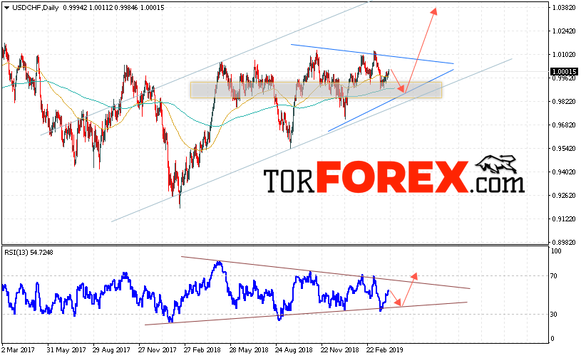 В пользу роста пары Доллар Франк выступит тест линии поддержки на индикаторе относительной силы. А также отскок от нижней границы модели «Треугольник». Отменой варианта роста USD/CHF станет падение и пробой области 0.9760. Это укажет на пробой нижней границы модели и продолжение падения пары на Форекс. Подтверждением роста пары на текущей торговой неделе 8 — 12 апреля 2019 выступит пробой области сопротивления и закрытие котировок выше уровня 1.0105.