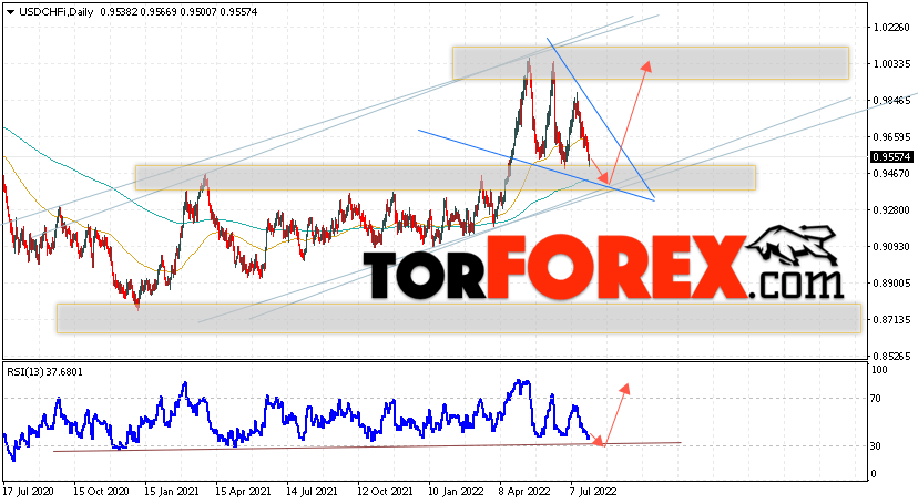 Дополнительным сигналом в пользу подъёма валютной пары Доллар Франк выступит тест линии тренда на индикаторе относительной силы. Вторым сигналом станет отскок от нижней границы бычьего канала, а также от модели ”Клин”. Отменой варианта роста USD/CHF станет падение и пробой области 0.9245. Это укажет на пробой области поддержки и продолжение падения пары на Форекс с целью ниже области 0.9005. Подтверждением подъёма пары на текущей торговой неделе 1 — 5 августа 2022 выступит пробой области сопротивления и закрытие котировок выше уровня 0.9805, что укажет на пробой верхней границы разворотной модели ”Клин” и начало отработки этой модели с целями вверху.