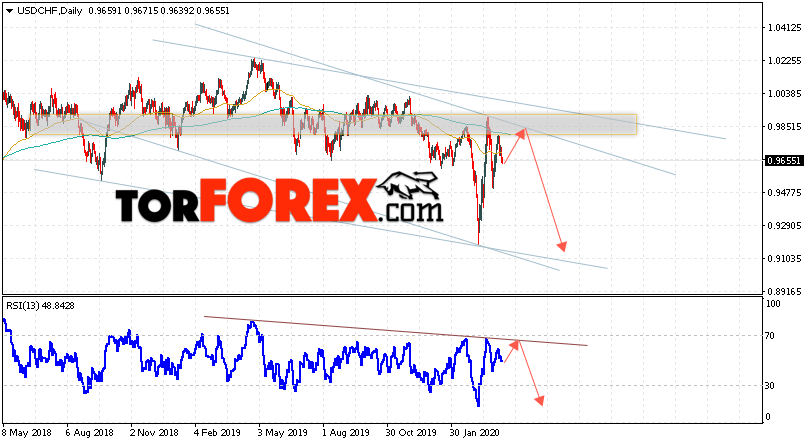 Дополнительным сигналом в пользу падения валютной пары Доллар Франк выступит тест линии тренда на индикаторе относительной силы. Вторым сигналом станет отскок от верхней границы нисходящего канала. Отменой варианта падения USD/CHF станет сильный рост и пробой области 1.0065. Это укажет на пробой верхней границы канала и продолжение роста пары на Форекс с целью выше области 1.0265. Подтверждением падения пары на текущей торговой неделе 13 — 17 апреля 2020 выступит пробой области поддержки и закрытие котировок ниже уровня 0.9475.