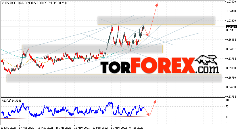 Дополнительным сигналом в пользу подъёма валютной пары Доллар Франк выступит тест линии тренда на индикаторе относительной силы. Вторым сигналом станет отскок от верхней границы нисходящего канала, который был пробит покупателями вверх. Отменой варианта подъёма USD/CHF станет падение и пробой области 0.9445. Это укажет на пробой области поддержки и продолжение падения пары на Форекс с целью ниже области 0.9225. Подтверждением подъёма пары на текущей торговой неделе 17 — 21 октября 2022 выступит пробой области сопротивления и закрытие котировок выше уровня 1.0195, пока же от этого уровня было два отбоя цены вниз.