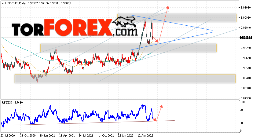 Дополнительным сигналом в пользу подъёма валютной пары Доллар Франк выступит тест линии тренда на индикаторе относительной силы. Вторым сигналом станет отскок от нижней границы бычьего канала. Отменой варианта роста USD/CHF станет падение и пробой области 0.9235. Это укажет на пробой области поддержки и продолжение падения пары на Форекс с целью ниже области 0.9025. Подтверждением подъёма пары на текущей торговой неделе 20 — 24 июня 2022 выступит пробой области сопротивления и закрытие котировок выше уровня 1.0105, что также укажет на пробой верхней модели ”Треугольник” и начало отработки этого паттерна с целями вверху.