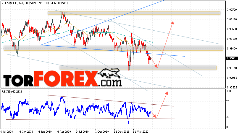 Дополнительным сигналом в пользу роста валютной пары Доллар Франк выступит тест линии тренда на индикаторе относительной силы. Вторым сигналом станет отскок от области поддержки. Отменой варианта роста USD/CHF станет падение и пробой области 0.9275. Это укажет на пробой области поддержки и продолжение падения пары на Форекс с целью ниже области 0.9005. Подтверждением подъёма пары на текущей торговой неделе 22 — 26 июня 2020 выступит пробой области сопротивления и закрытие котировок выше уровня 0.9705, что укажет на пробой верхней границы нисходящего канала.