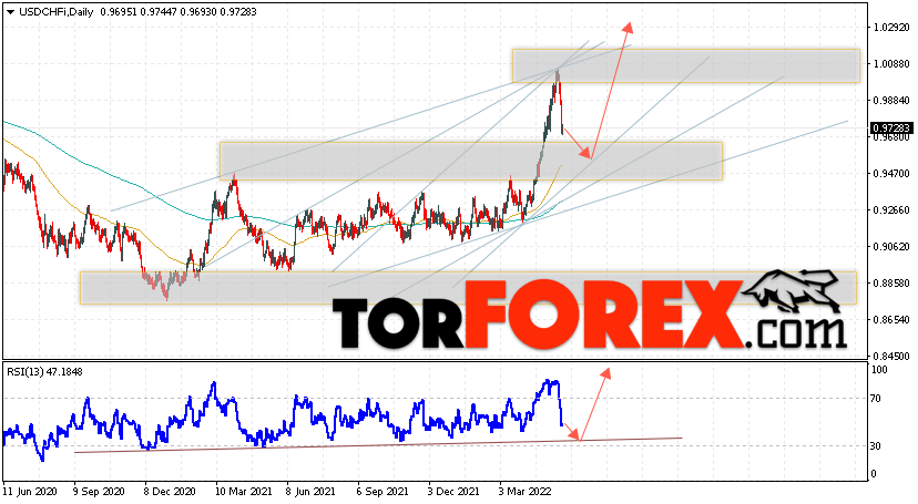 Таким образом, USD/CHF прогноз курса Франка на 23 — 27 мая 2022 предполагает попытку теста уровня поддержки вблизи области 0.9615. Затем, продолжение роста USD/CHF в область выше уровня 1.0295. В пользу подъёма выступит тест линии тренда на индикаторе относительной силы. Отменой варианта роста USD/CHF станет пробой области поддержки и закрытие котировок ниже уровня 0.9355. Это укажет на продолжение падения пары с потенциальной целью ниже уровня 0.9135.