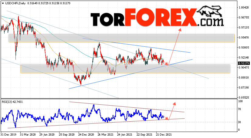 Таким образом, USD/CHF прогноз курса Франка на 24 — 28 января 2022 предполагает попытку теста уровня поддержки вблизи области 0.9055. Затем, продолжение роста USD/CHF в область выше уровня 0.9715. В пользу подъёма выступит тест линии тренда на индикаторе относительной силы. Отменой варианта роста USD/CHF станет пробой области поддержки и закрытие котировок ниже уровня 0.8865. Это укажет на продолжение падения пары с потенциальной целью ниже уровня 0.8465.