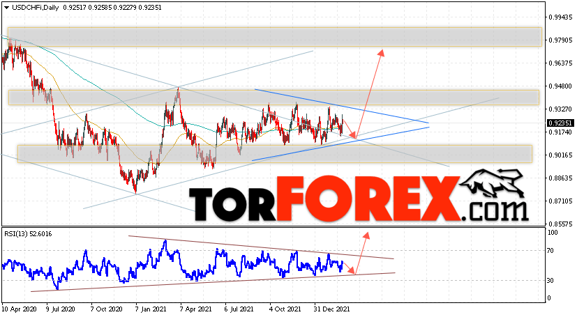 Дополнительным сигналом в пользу подъёма валютной пары Доллар Франк выступит тест линии тренда на индикаторе относительной силы. Вторым сигналом станет отскок от нижней бычьего канала, а также от нижней границы модели ”Треугольник”. Отменой варианта роста USD/CHF станет падение и пробой области 0.8905. Это укажет на пробой области поддержки и продолжение падения пары на Форекс с целью ниже области 0.8525. Подтверждением подъёма пары на текущей торговой неделе 28 февраля — 4 марта 2022 выступит пробой области сопротивления и закрытие котировок выше уровня 0.9435, что укажет на пробой верхней границы модели ”Треугольник” и начало отработки модели с целями вверху.