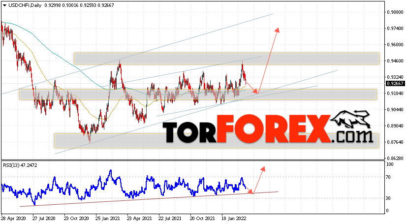 Таким образом, USD/CHF прогноз курса Франка на 28 марта — 1 апреля 2022 предполагает попытку теста уровня поддержки вблизи области 0.9185. Затем, продолжение роста USD/CHF в область выше уровня 0.9755. В пользу подъёма выступит тест линии тренда на индикаторе относительной силы. Отменой варианта роста USD/CHF станет пробой области поддержки и закрытие котировок ниже уровня 0.9105. Это укажет на продолжение падения пары с потенциальной целью ниже уровня 0.8725.