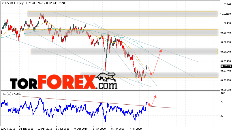 Дополнительным сигналом в пользу роста валютной пары Доллар Франк выступит тест линии тренда на индикаторе относительной силы. Вторым сигналом станет отскок от верхней границы нисходящего канала. Отменой варианта роста USD/CHF станет падение и пробой области 0.8845. Это укажет на пробой области поддержки и продолжение падения пары на Форекс с целью ниже области 0.8425. Подтверждением подъёма пары на текущей торговой неделе 28 сентября — 2 октября 2020 выступит пробой области сопротивления и закрытие котировок выше уровня 0.9365.