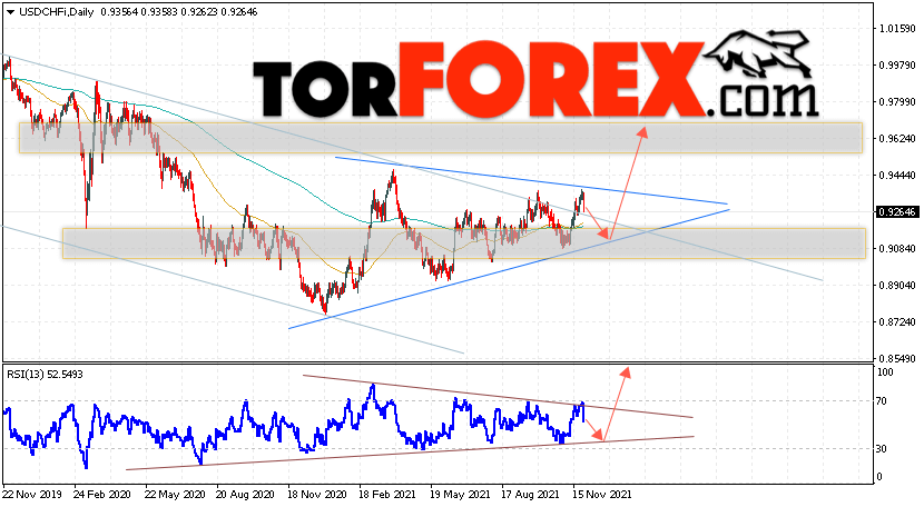 Дополнительным сигналом в пользу подъёма валютной пары Доллар Франк выступит тест линии тренда на индикаторе относительной силы, сейчас же происходит отскок от линии сопротивления, сильным сигналом к подъёму станет пробой этой линии. Вторым сигналом станет отскок от нижней границы модели ”Треугольник”. Отменой варианта роста USD/CHF станет падение и пробой области 0.8905. Это укажет на пробой области поддержки и продолжение падения пары на Форекс с целью ниже области 0.8645. Подтверждением подъёма пары на текущей торговой неделе 29 ноября — 3 декабря 2021 выступит пробой области сопротивления и закрытие котировок выше уровня 0.9475, что укажет на прорыв верхней границы модели ”Треугольник” и начало отработки этого паттерна.