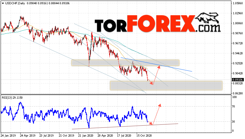 Дополнительным сигналом в пользу подъёма валютной пары Доллар Франк выступит тест линии тренда на индикаторе относительной силы. Вторым сигналом станет отскок от области поддержки. Отменой варианта роста USD/CHF станет падение и пробой области 0.8705. Это укажет на пробой области поддержки и продолжение падения пары на Форекс с целью ниже области 0.8345. Подтверждением подъёма пары на текущей торговой неделе 7 — 11 декабря 2020 выступит пробой области сопротивления и закрытие котировок выше уровня 0.9265, что укажет на пробой верхней гардины нисходящего канала.
