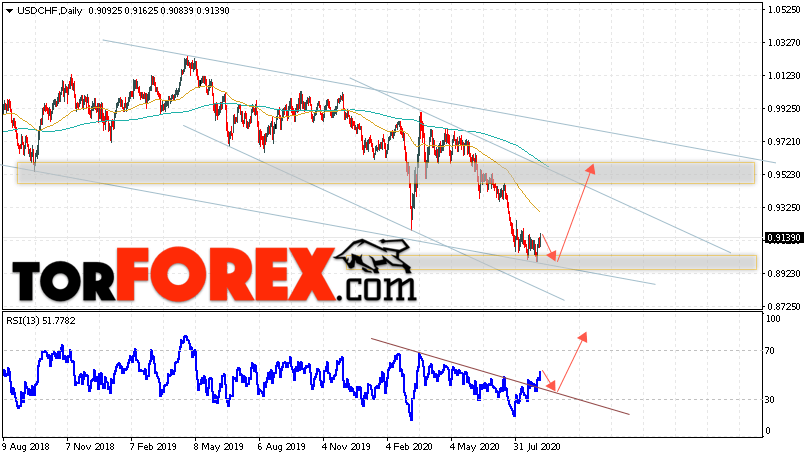 Дополнительным сигналом в пользу роста валютной пары Доллар Франк выступит тест линии тренда на индикаторе относительной силы. Вторым сигналом станет отскок от уровня поддержки на графике цены. Отменой варианта роста USD/CHF станет падение и пробой области 0.8815. Это укажет на пробой области поддержки и продолжение падения пары на Форекс с целью ниже области 0.8425. Подтверждением подъёма пары на текущей торговой неделе 7 — 11 сентября 2020 выступит пробой области сопротивления и закрытие котировок выше уровня 0.9285.