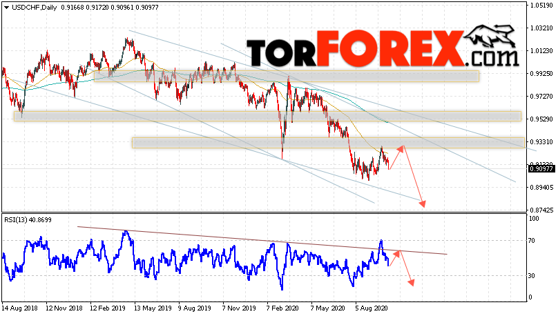 Дополнительным сигналом в пользу падения валютной пары Доллар Франк выступит тест линии тренда на индикаторе относительной силы. Вторым сигналом станет отскок от верхней границы нисходящего канала. Отменой варианта падения USD/CHF станет сильный рост и пробой области 0.9505. Это укажет на пробой области сопротивления и продолжение роста пары на Форекс с целью ниже области 0.9865. Подтверждением падения пары на текущей торговой неделе 12 — 16 октября 2020 выступит пробой области поддержки и закрытие котировок ниже уровня 0.8955.