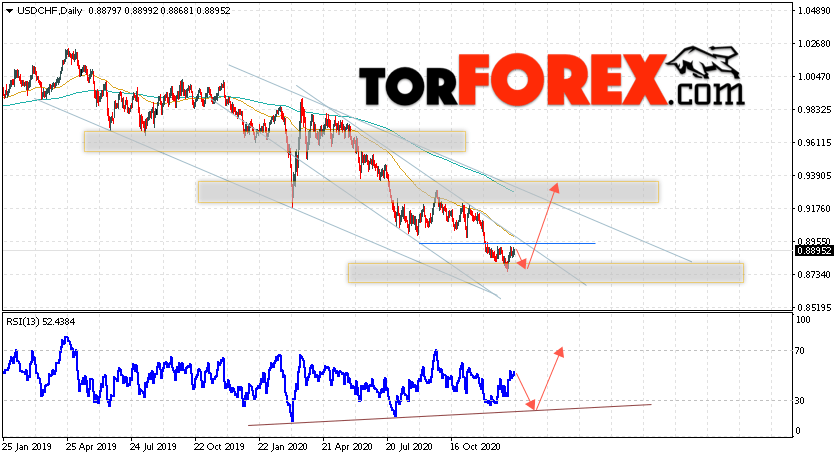 Дополнительным сигналом в пользу подъёма валютной пары Доллар Франк выступит тест линии тренда на индикаторе относительной силы. Вторым сигналом станет завершения формирования перевернутой модели ”Голова и плечи”. Отменой варианта роста USD/CHF станет падение и пробой области 0.8575. Это укажет на пробой области поддержки и продолжение падения пары на Форекс с целью ниже области 0.8265. Подтверждением подъёма пары на текущей торговой неделе неделю 18 — 22 января 2021 выступит пробой области сопротивления и закрытие котировок выше уровня 0.9025, что укажет на пробой верхней границы нисходящего канала.