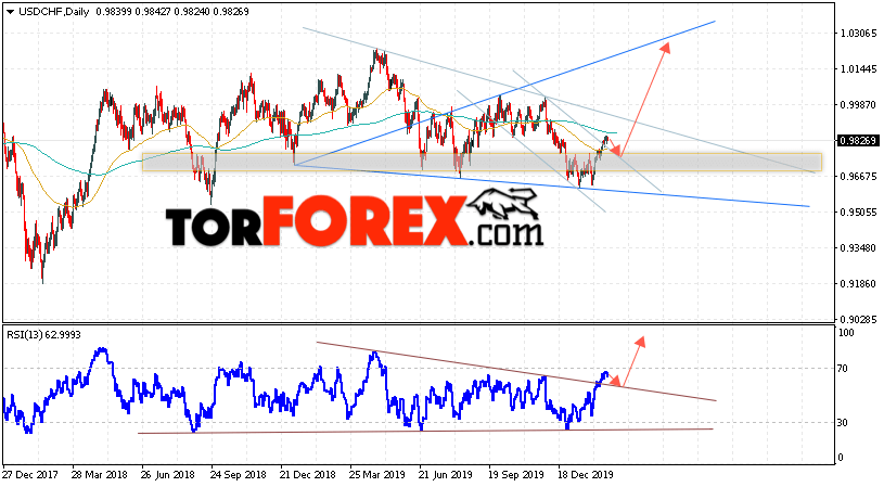 Дополнительным сигналом в пользу роста валютной пары Доллар Франк выступит тест линии тренда на индикаторе относительной силы. Вторым сигналом станет отскок от нижней бычьей модели «Волна Вульфа». Отменой варианта роста USD/CHF станет падение и пробой области 0.9475. Это укажет на пробой нижней границы восходящего канала и продолжение падения пары на Форекс с целью ниже области 0.9195. Подтверждением роста пары на текущей торговой неделе 24 — 28 февраля 2020 выступит пробой области сопротивления и закрытие котировок выше уровня 0.9965.