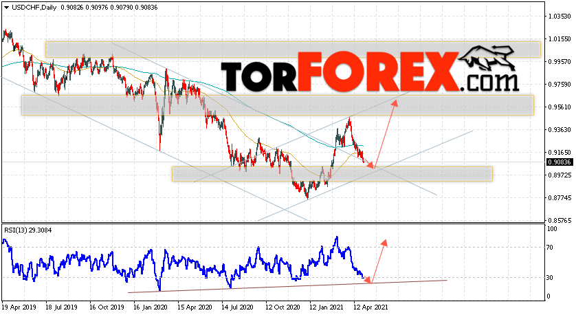 Дополнительным сигналом в пользу подъёма валютной пары Доллар Франк выступит тест линии тренда на индикаторе относительной силы. Вторым сигналом станет отскок от верхней границы нисходящего канала. Отменой варианта роста USD/CHF станет падение и пробой области 0.8755. Это укажет на пробой области поддержки и продолжение падения пары на Форекс с целью ниже области 0.8405. Подтверждением подъёма пары на текущей торговой неделе неделю 3 — 7 мая 2021 выступит пробой области сопротивления и закрытие котировок выше уровня 0.9545.