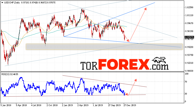 Таким образом, USD/CHF прогноз курса Франка на неделю 6 — 10 января 2020 предполагает попытку теста уровня поддержки вблизи области 0.9545. Затем продолжение роста USD/CHF в область выше уровня 1.0265. В пользу подъёма выступит тест линии тренда на индикаторе относительной силы. Отменой варианта роста USD/CHF станет пробой области поддержки и закрытие котировок ниже уровня 0.9405. Это укажет на продолжение падения пары с потенциальной целью ниже уровня 0.9195.