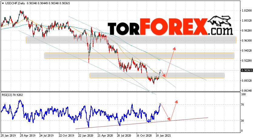 Дополнительным сигналом в пользу подъёма валютной пары Доллар Франк выступит тест линии тренда на индикаторе относительной силы. Вторым сигналом станет отскок от верхней границы нисходящего канала. Отменой варианта роста USD/CHF станет падение и пробой области 0.8655. Это укажет на пробой области поддержки и продолжение падения пары на Форекс с целью ниже области 0.8255. Подтверждением подъёма пары на текущей торговой неделе неделю 8 — 12 февраля 2021 выступит пробой области сопротивления и закрытие котировок выше уровня 0.9255, что укажет на пробой верхней границы нисходящего канала.