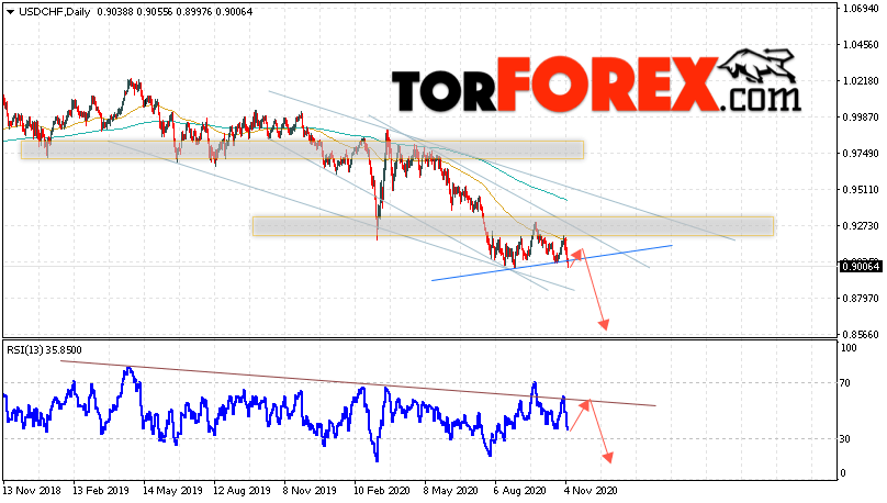 Дополнительным сигналом в пользу падения валютной пары Доллар Франк выступит тест линии тренда на индикаторе относительной силы. Вторым сигналом станет отскок от верхней границы нисходящего канала. Отменой варианта падения USD/CHF станет сильный рост и пробой области 0.9455. Это укажет на пробой области сопротивления и продолжение роста пары на Форекс с целью выше области 0.9805. Подтверждением падения пары на текущей торговой неделе 9 — 13 ноября 2020 выступит пробой области поддержки и закрытие котировок ниже уровня 0.8905.