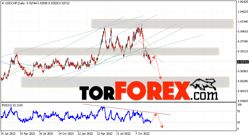 Дополнительным сигналом в пользу падения валютной пары Доллар Франк выступит тест линии тренда на индикаторе относительной силы. Вторым сигналом станет отскок от верхней границы нисходящего канала. Отменой варианта падения USD/CHF станет сильный рост и пробой области 0.9635. Это укажет на пробой области сопротивления и продолжение роста пары на Форекс с целью выше области 1.0175. Подтверждением падению пары на текущей торговой неделе 19 — 23 декабря 2022 выступит пробой области поддержки и закрытие котировок ниже уровня 0.9175.