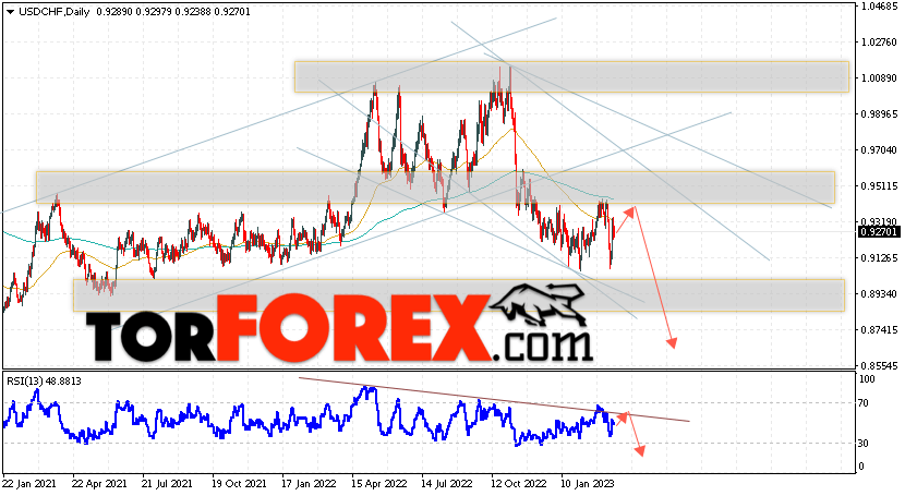 Дополнительным сигналом в пользу снижения валютной пары Доллар Франк выступит тест линии тренда на индикаторе относительной силы. Вторым сигналом станет отскок от верхней границы нисходящего канала. Отменой варианта падения USD/CHF станет сильный рост и пробой области 0.9765. Это укажет на пробой области сопротивления и продолжение роста пары на Форекс с целью выше области 1.0155. Подтверждением падению пары на текущей торговой неделе 20 — 24 марта 2023 выступит пробой области поддержки и закрытие котировок ниже уровня 0.9075.