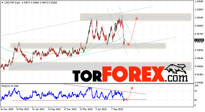 Дополнительным сигналом в пользу подъёма валютной пары Доллар Франк выступит тест линии тренда на индикаторе относительной силы. Вторым сигналом станет отскок от нижней границы бычьего канала. Отменой варианта подъёма USD/CHF станет падение и пробой области 0.9205. Это укажет на пробой области поддержки и продолжение падения пары на Форекс с целью ниже области 0.8735. Подтверждением подъёма пары на текущей торговой неделе 21 — 25 ноября 2022 выступит пробой области сопротивления и закрытие котировок выше уровня 0.9725, что укажет на пробой верхней границы нисходящего канала коррекции.
