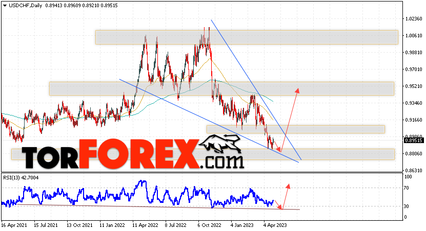 Дополнительным сигналом в пользу подъёма валютной пары Доллар Франк выступит тест линии тренда на индикаторе относительной силы. Вторым сигналом станет отскок от нижней границы бычьей модели ”Клин”. Отменой варианта роста USD/CHF станет падение и пробой области 0.8625. Это укажет на пробой области поддержки и продолжение падения пары на Форекс с целью ниже области 0.8245. Подтверждением росту пары на текущей торговой неделе 1 — 5 мая 2023 выступит пробой области сопротивления и закрытие котировок выше уровня 0.9165, что укажет на пробой верхней границы бычьей модели «Клин» и начало отработки модели с целями вверху.