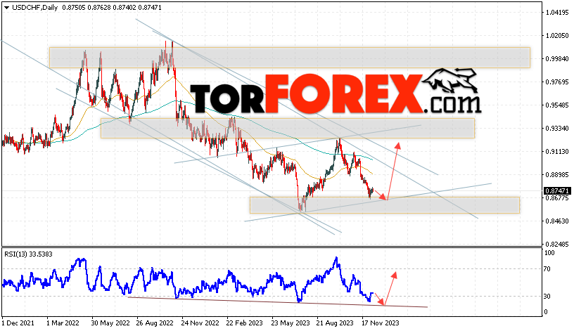Дополнительным сигналом в пользу роста валютной пары Доллар Франк выступит тест линии тренда на индикаторе относительной силы (RSI). Вторым сигналом станет отскок от нижней границы бычьего канала. Отменой варианта подъёма USD/CHF станет падение и пробой области 0.8515. Это укажет на пробой области поддержки и продолжение падения пары на Форекс с целью ниже области 0.8305. Подтверждением росту пары на текущей торговой неделе 11 — 15 декабря 2023 выступит пробой области сопротивления и закрытие котировок выше уровня 0.9075, что укажет на пробой верхней границы нисходящего канала.