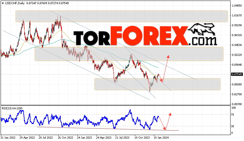 Дополнительным сигналом в пользу роста валютной пары Доллар Франк выступит тест линии тренда на индикаторе относительной силы (RSI). Вторым сигналом станет отскок от верхней границы нисходящего канала. Отменой варианта подъёма USD/CHF станет падение и пробой области 0.8245. Это укажет на пробой области поддержки и продолжение падения пары на Форекс с целью ниже области 0.7935. Подтверждением росту пары на текущей торговой неделе 12 — 16 февраля 2024 выступит пробой области сопротивления и закрытие котировок выше уровня 0.9024, что укажет на пробой верхней границы нисходящего канала.