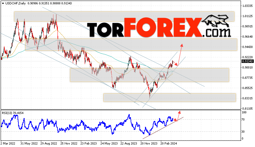 Дополнительным сигналом в пользу роста валютной пары Доллар Франк выступит тест линии тренда на индикаторе относительной силы (RSI). Вторым сигналом станет отскок от верхней границы медвежьего канала. Отменой варианта подъёма USD/CHF станет падение и пробой области 0.8845. Это укажет на пробой области поддержки и продолжение снижения пары на Форекс с целью ниже области 0.8525. Подтверждением росту пары на текущей торговой неделе 15 — 19 апреля 2024 выступит пробой области сопротивления и закрытие котировок выше уровня 0.9265, что укажет на пробой верхней границы разворотной модели «Двойное дно» и начало отработки паттерна с целями вверху.
