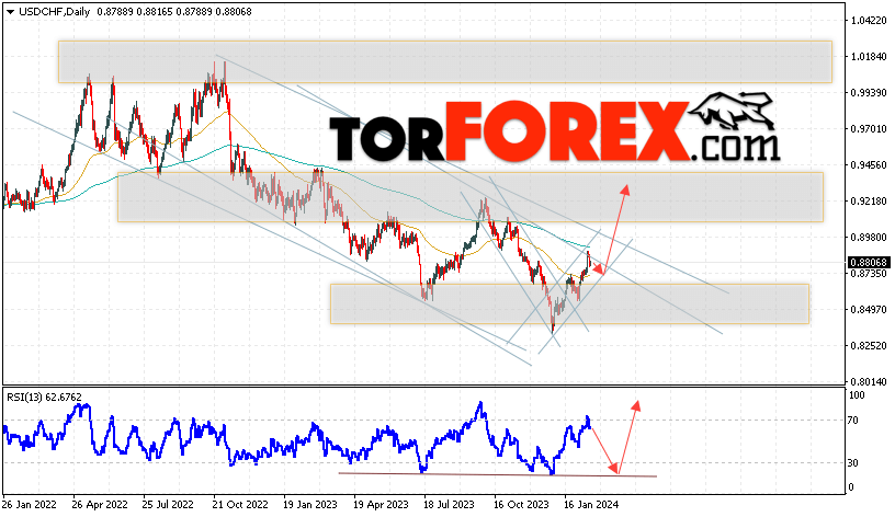 Дополнительным сигналом в пользу роста валютной пары Доллар Франк выступит тест линии тренда на индикаторе относительной силы (RSI). Вторым сигналом станет отскок от нижней границы бычьего канала. Отменой варианта подъёма USD/CHF станет падение и пробой области 0.8465. Это укажет на пробой области поддержки и продолжение падения пары на Форекс с целью ниже области 0.8175. Подтверждением росту пары на текущей торговой неделе 19 — 23 февраля 2024 выступит пробой области сопротивления и закрытие котировок выше уровня 0.9085, что укажет на пробой верхней границы нисходящего канала.