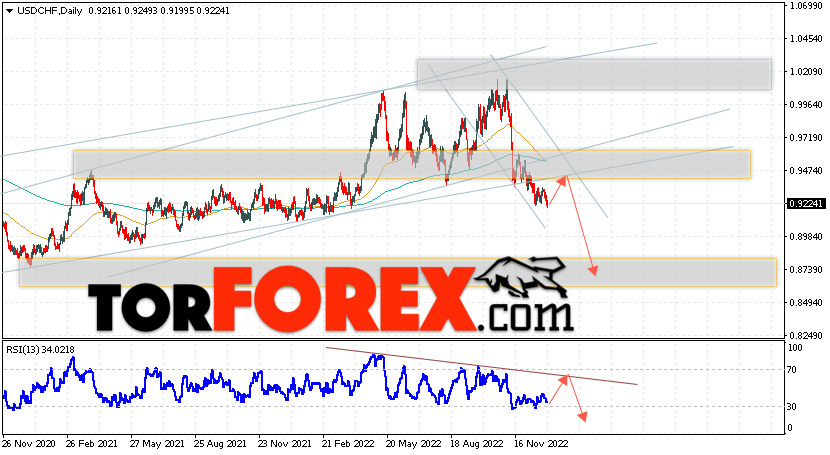 Дополнительным сигналом в пользу падения валютной пары Доллар Франк выступит тест линии тренда на индикаторе относительной силы. Вторым сигналом станет отскок от нижней границы бычьего канала. Отменой варианта падения USD/CHF станет сильный рост и пробой области 0.9835. Это укажет на пробой области сопротивления и продолжение роста пары на Форекс с целью выше области 1.0245. Подтверждением падению пары на текущей торговой неделе 2 — 6 января 2023 выступит пробой области поддержки и закрытие котировок ниже уровня 0.9095.