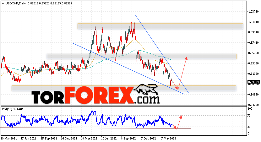 Дополнительным сигналом в пользу подъёма валютной пары Доллар Франк выступит тест линии тренда на индикаторе относительной силы. Вторым сигналом станет отскок от нижней границы бычьей модели ”Клин”. Отменой варианта роста USD/CHF станет падение и пробой области 0.8635. Это укажет на пробой области поддержки и продолжение падения пары на Форекс с целью ниже области 0.8265. Подтверждением росту пары на текущей торговой неделе 24 — 28 апреля 2023 выступит пробой области сопротивления и закрытие котировок выше уровня 0.9145, что укажет на пробой верхней границы бычьей модели ”Клин” и начало отработки модели с целями вверху.