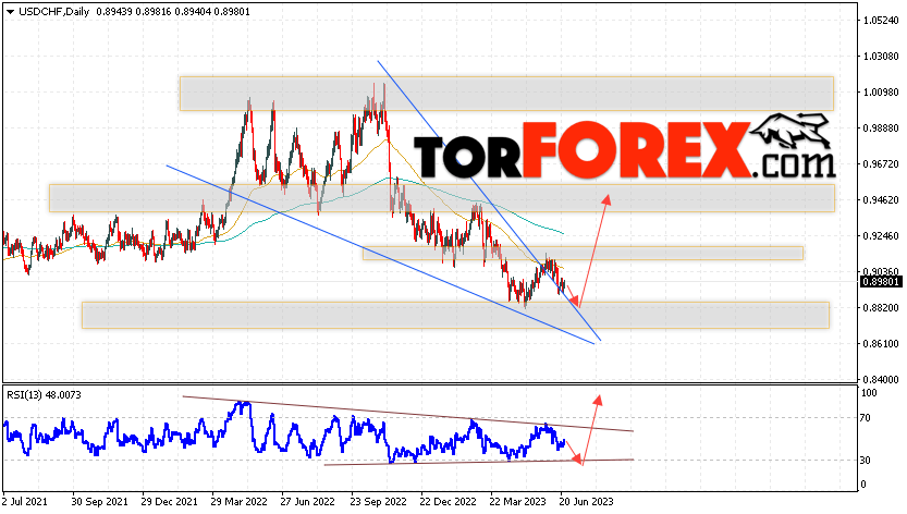 Дополнительным сигналом в пользу подъёма валютной пары Доллар Франк выступит тест линии тренда на индикаторе относительной силы. Вторым сигналом станет отскок от верхней границы разворотной модели «Клин». Отменой варианта роста USD/CHF станет падение и пробой области 0.8635. Это укажет на пробой области поддержки и продолжение падения пары на Форекс с целью ниже области 0.8315. Подтверждением росту пары на текущей торговой неделе 26 — 30 июня 2023 выступит пробой области сопротивления и закрытие котировок выше уровня 0.9105.