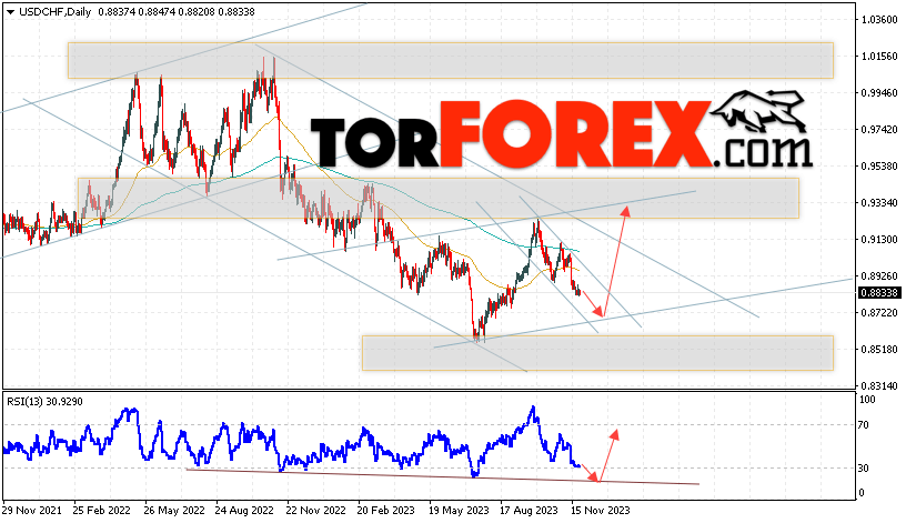 Дополнительным сигналом в пользу роста валютной пары Доллар Франк выступит тест линии тренда на индикаторе относительной силы (RSI). Вторым сигналом станет отскок от нижней границы бычьего канала. Отменой варианта подъёма USD/CHF станет падение и пробой области 0.8505. Это укажет на пробой области поддержки и продолжение падения пары на Форекс с целью ниже области 0.8335. Подтверждением росту пары на текущей торговой неделе 27 ноября — 1 декабря 2023 выступит пробой области сопротивления и закрытие котировок выше уровня 0.9145, что укажет на пробой верхней границы нисходящего канала.