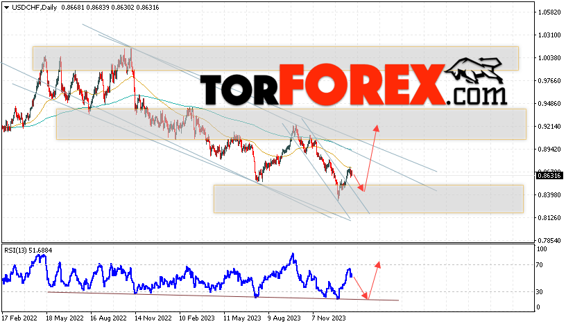 Дополнительным сигналом в пользу роста валютной пары Доллар Франк выступит тест линии тренда на индикаторе относительной силы (RSI). Вторым сигналом станет отскок от верхней границы нисходящего канала. Отменой варианта подъёма USD/CHF станет падение и пробой области 0.8145. Это укажет на пробой области поддержки и продолжение падения пары на Форекс с целью ниже области 0.7865. Подтверждением росту пары на текущей торговой неделе 29 января — 2 февраля 2024 выступит пробой области сопротивления и закрытие котировок выше уровня 0.8975, что укажет на пробой верхней границы нисходящего канала.