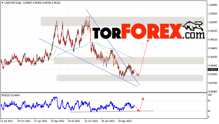 Дополнительным сигналом в пользу подъёма валютной пары Доллар Франк выступит тест линии тренда на индикаторе относительной силы. Вторым сигналом станет отскок от верхней границы разворотной модели «Клин». Отменой варианта роста USD/CHF станет падение и пробой области 0.8635. Это укажет на пробой области поддержки и продолжение падения пары на Форекс с целью ниже области 0.8295. Подтверждением росту пары на текущей торговой неделе 3 — 7 июля 2023 выступит пробой области сопротивления и закрытие котировок выше уровня 0.9105.