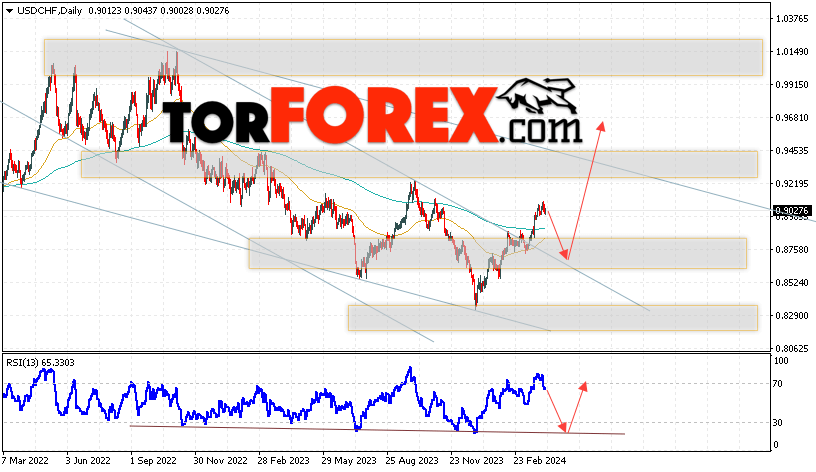 Дополнительным сигналом в пользу роста валютной пары Доллар Франк выступит тест линии тренда на индикаторе относительной силы (RSI). Вторым сигналом станет отскок от верхней границы медвежьего канала. Отменой варианта подъёма USD/CHF станет падение и пробой области 0.8465. Это укажет на пробой области поддержки и продолжение снижения пары на Форекс с целью ниже области 0.8275. Подтверждением росту пары на текущей торговой неделе 8 — 12 апреля 2024 выступит пробой области сопротивления и закрытие котировок выше уровня 0.9265, что укажет на пробой верхней границы разворотной модели «Двойное дно» и начало отработки паттерна с целями вверху.