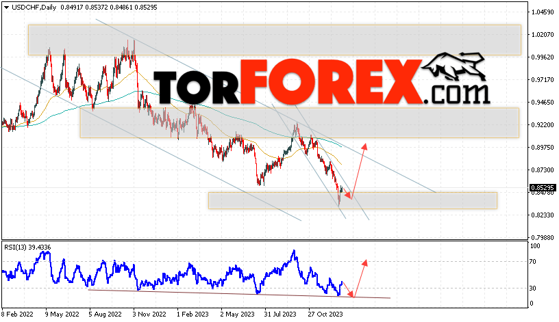 Дополнительным сигналом в пользу роста валютной пары Доллар Франк выступит тест линии тренда на индикаторе относительной силы (RSI). Вторым сигналом станет отскок от нижней границы разворотной модели «Двойное дно». Отменой варианта подъёма USD/CHF станет падение и пробой области 0.8235. Это укажет на пробой области поддержки и продолжение падения пары на Форекс с целью ниже области 0.7965. Подтверждением росту пары на текущей торговой неделе 8 — 12 января 2024 выступит пробой области сопротивления и закрытие котировок выше уровня 0.8755, что укажет на пробой верхней границы нисходящего канала.