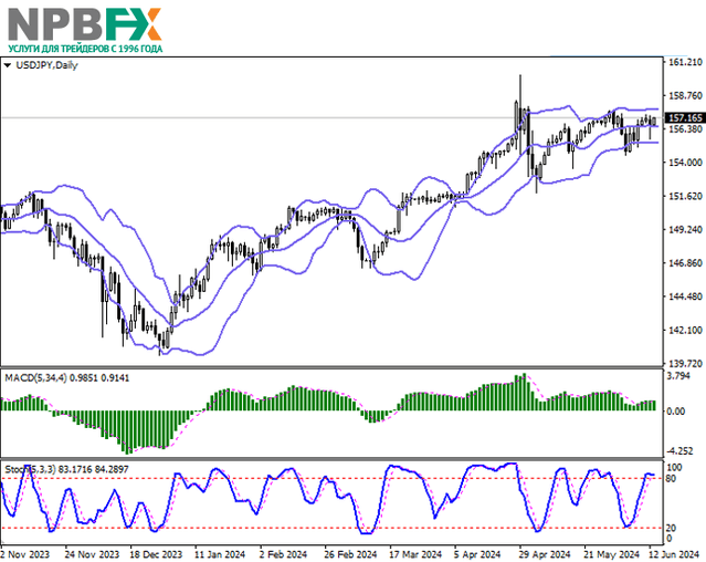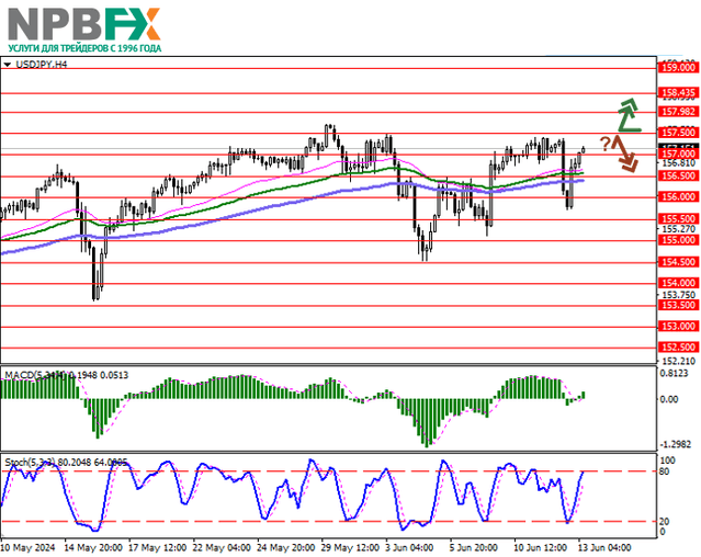 Пара USD/JPY показывает умеренный рост, восстанавливаясь после неуверенной попытки снижения накануне: инструмент тестирует отметку 157.15 на пробой вверх, практически полностью восстановив позиции после «медвежьей» коррекции. Напомним, что американская валюта резко снизилась после публикации майских данных по инфляции, а также итогов двухдневного заседания ФРС США. Базовый индекс потребительских цен без учёта продовольственных товаров и энергоносителей в годовом исчислении замедлился с 3,6% до 3,4%, а в месячном выражении — с 0,3% до 0,2%, укрепив ожидания аналитиков относительно возможного начала программы снижения стоимости заимствований в сентябре.