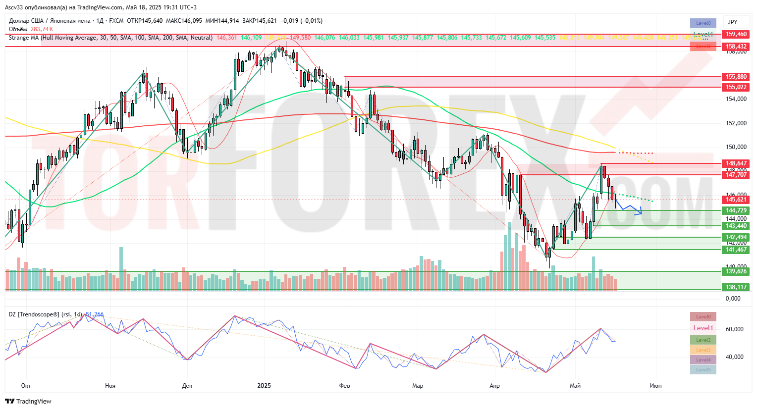Курс USD/JPY завершил восстановление и сформировал разворотную свечную структуру вблизи ключевого сопротивления. Технические сигналы указывают на возможное продолжение снижения в рамках коррекции от предыдущего роста. На фоне фундаментальной неопределённости и технических ограничений рынок склонен к ослаблению доллара по отношению к иене в краткосрочной перспективе.