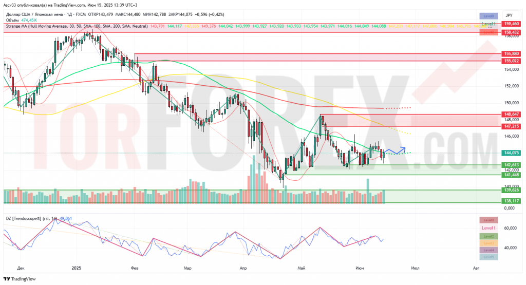 Пара USD/JPY завершила вторую неделю июня попыткой выйти выше уровня 144,00, однако пробой оказался неубедительным. Несмотря на постепенное восстановление от области поддержки 141,50–142,60, рынок сохраняет признаки неопределённости. Глобальная структура остаётся нисходящей, хотя в краткосрочном периоде сформировался диапазон.